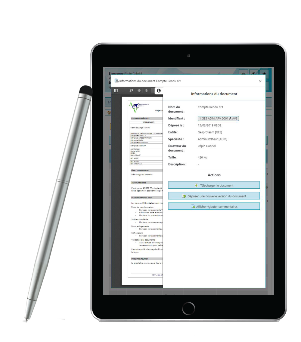 Chaque utilisateur, selon ses droits, accède aux documents déposés sur le projet. Seules les dernières versions de documents sont directement téléchargeables et visualisables. Les anciennes versions restent consultables en affichant les archives.